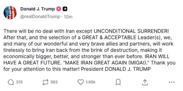 ABŞ Prezidenti Donald Tramp İrandan qeyd-şərtsiz kapitulyasiya tələb edib.